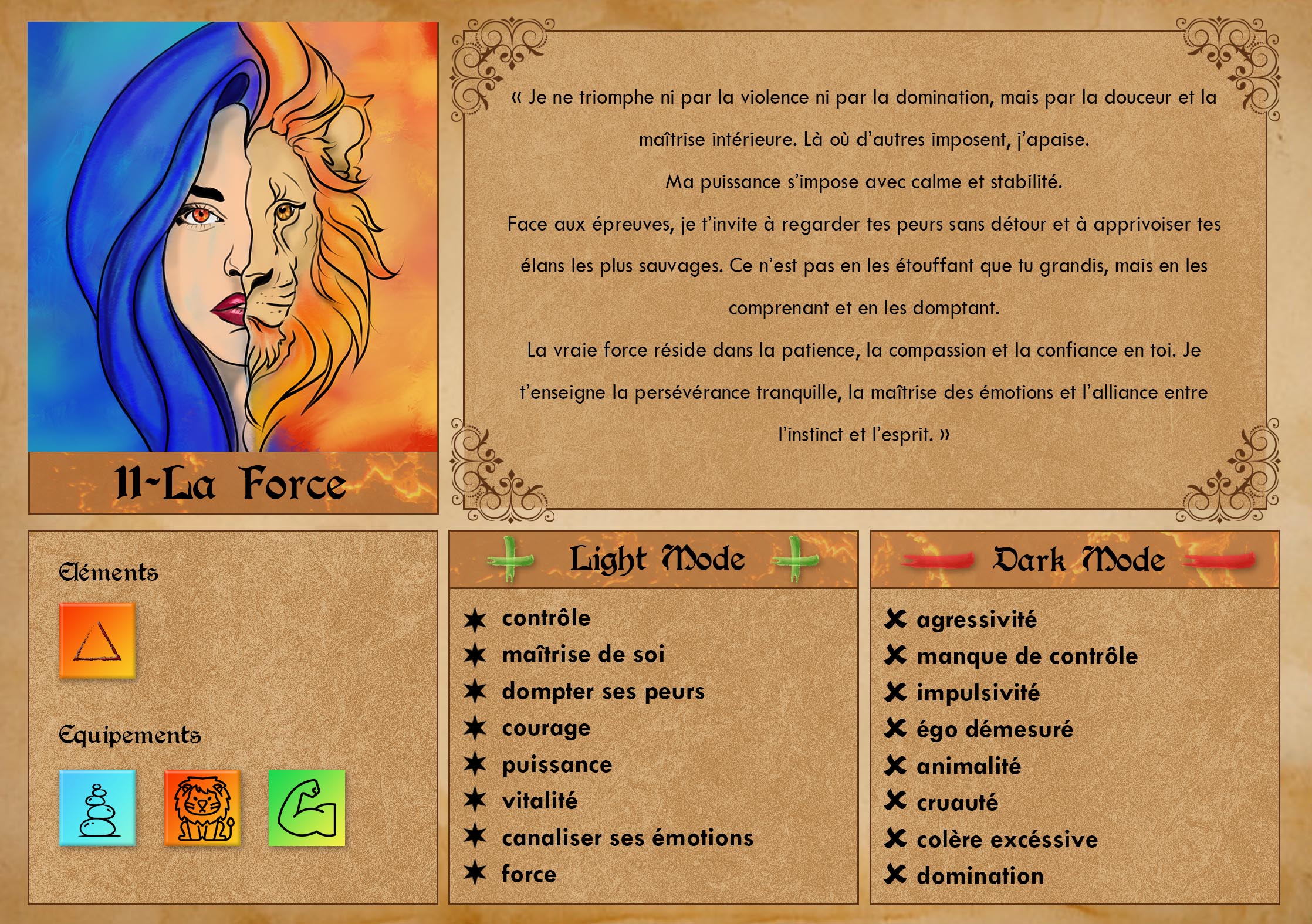 La Force est le 11ème arcane majeur dans le tarot de Marseille. En numérologie, le nombre 11 est un maître-nombre, porteur d’intuition élevée, d’inspiration et de puissance spirituelle. Il symbolise une énergie intense qui demande à être canalisée avec conscience.