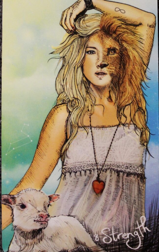 La force apparaît mi-femme, mi-lion avec un agneau sur les genoux. Cela montre comment elle dompte ses instincts et maîtrise sa puissance.