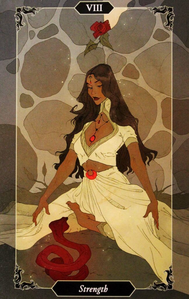 Dans cette interprétation La Force charme un serpent. Elle est calme, confiante, emplie d’assurance et de self-control.