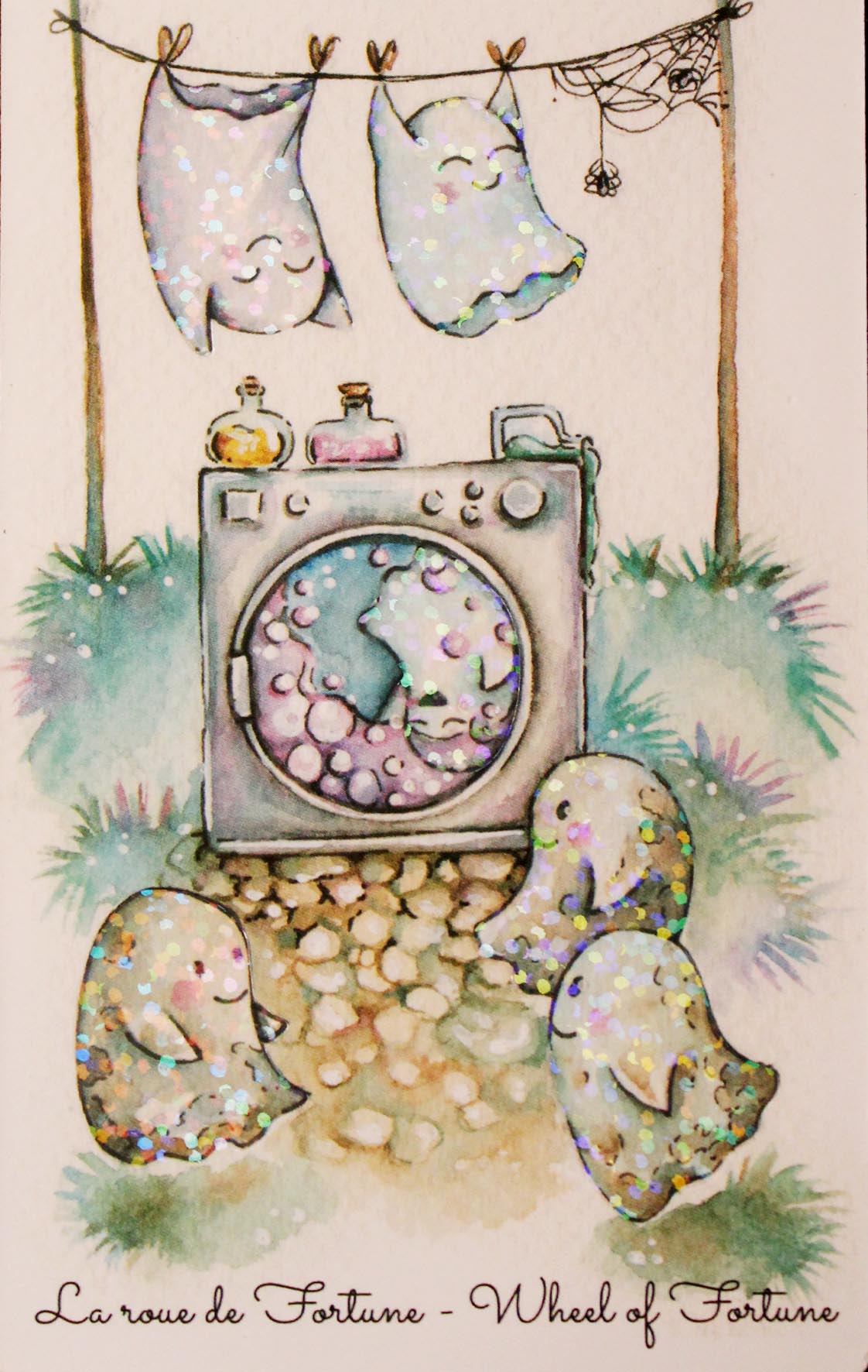 Dans le Rider-Waite-Smith, la Roue flotte dans l’espace, entourée au quatres coins de la carte de figures ailées représentant les quatre évangélistes et les signes fixes du zodiaque. Ici, le changement prend une dimension cosmique. Il n’est plus seulement personnel, mais inscrit dans un ordre plus vaste, régi par des forces universelles. La Roue devient alors un symbole de destin et de synchronicité.